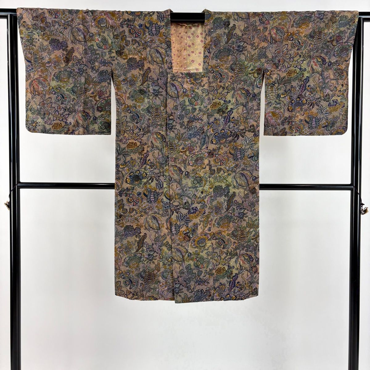 道行 身丈109 cm 裄丈64.5 M 和装コート 角衿 草花 灰紫 正絹
