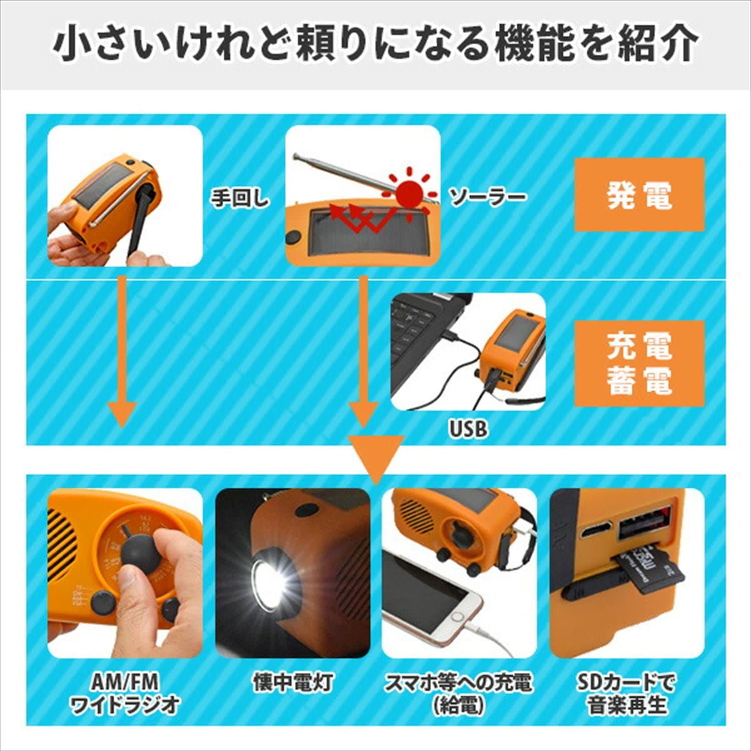 ※イヤホンは別売です。●機能:ラジオ、懐中電灯、蓄電池、スピーカー