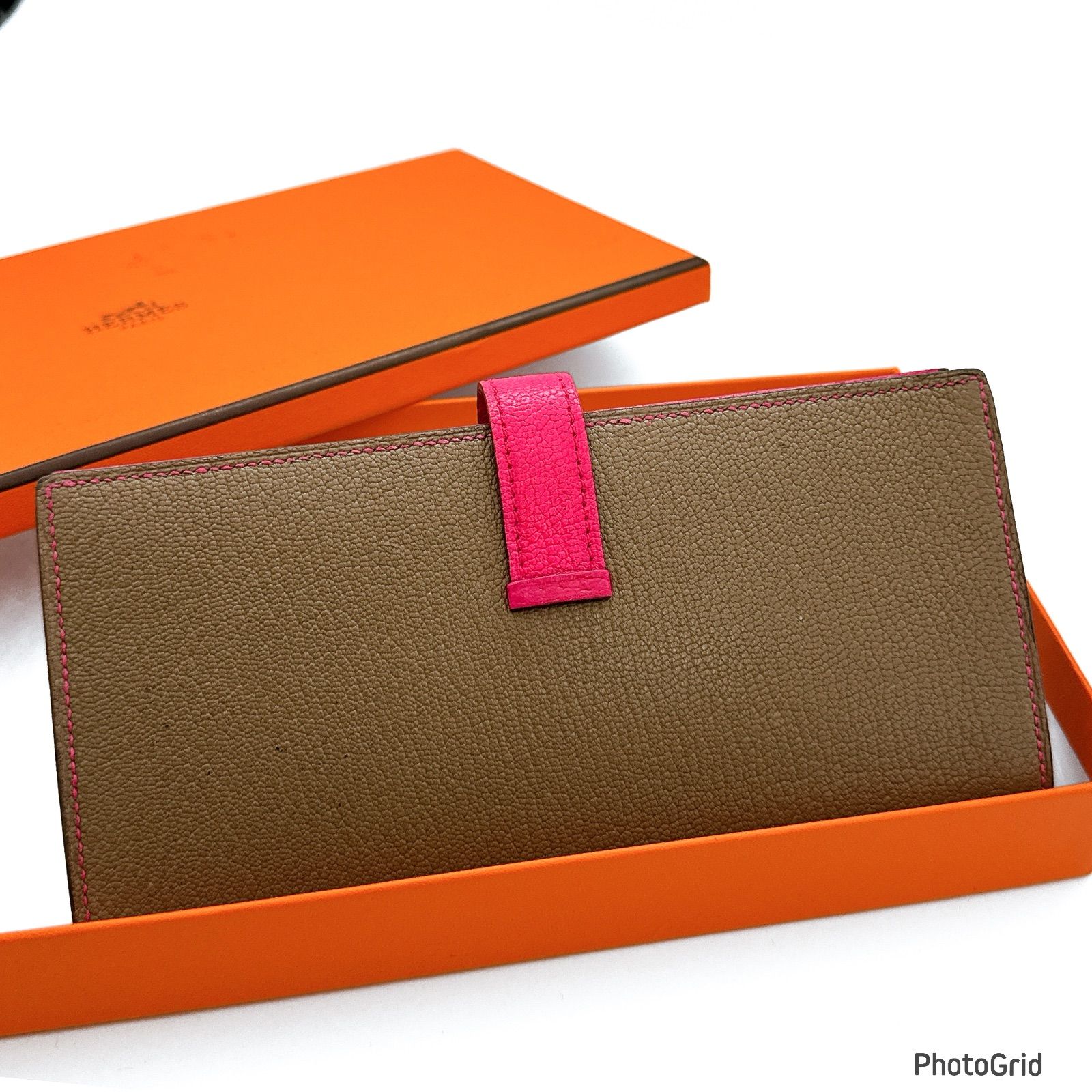 エルメス ベアン スフレ エトゥープ ピンク バイ ⬜︎O シェーブル二つ折り 長財布