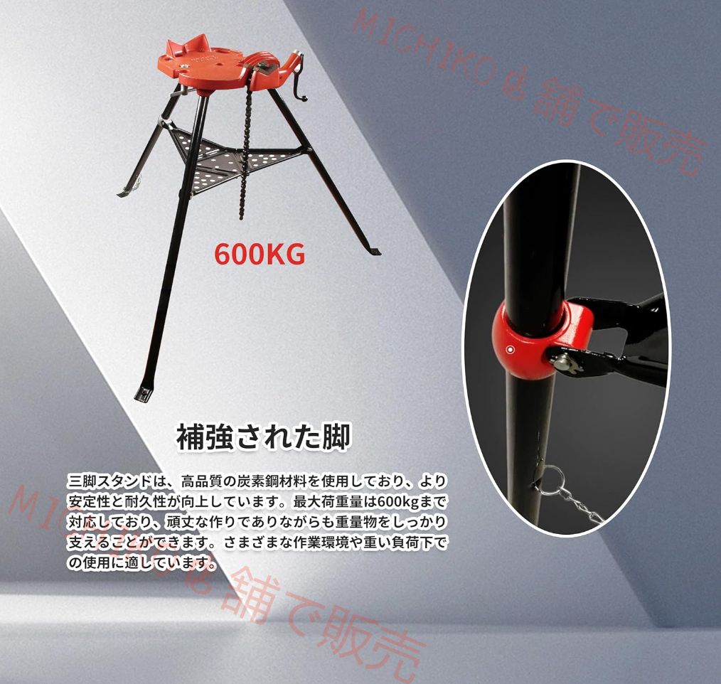 【補強された脚】三脚スタンドは高品質の炭素鋼を使用し、安定性と耐久性が向上しています。最大荷重量は600kgで、重量物をしっかり支えます。さまざまな作業環境や重い負荷に適しています。