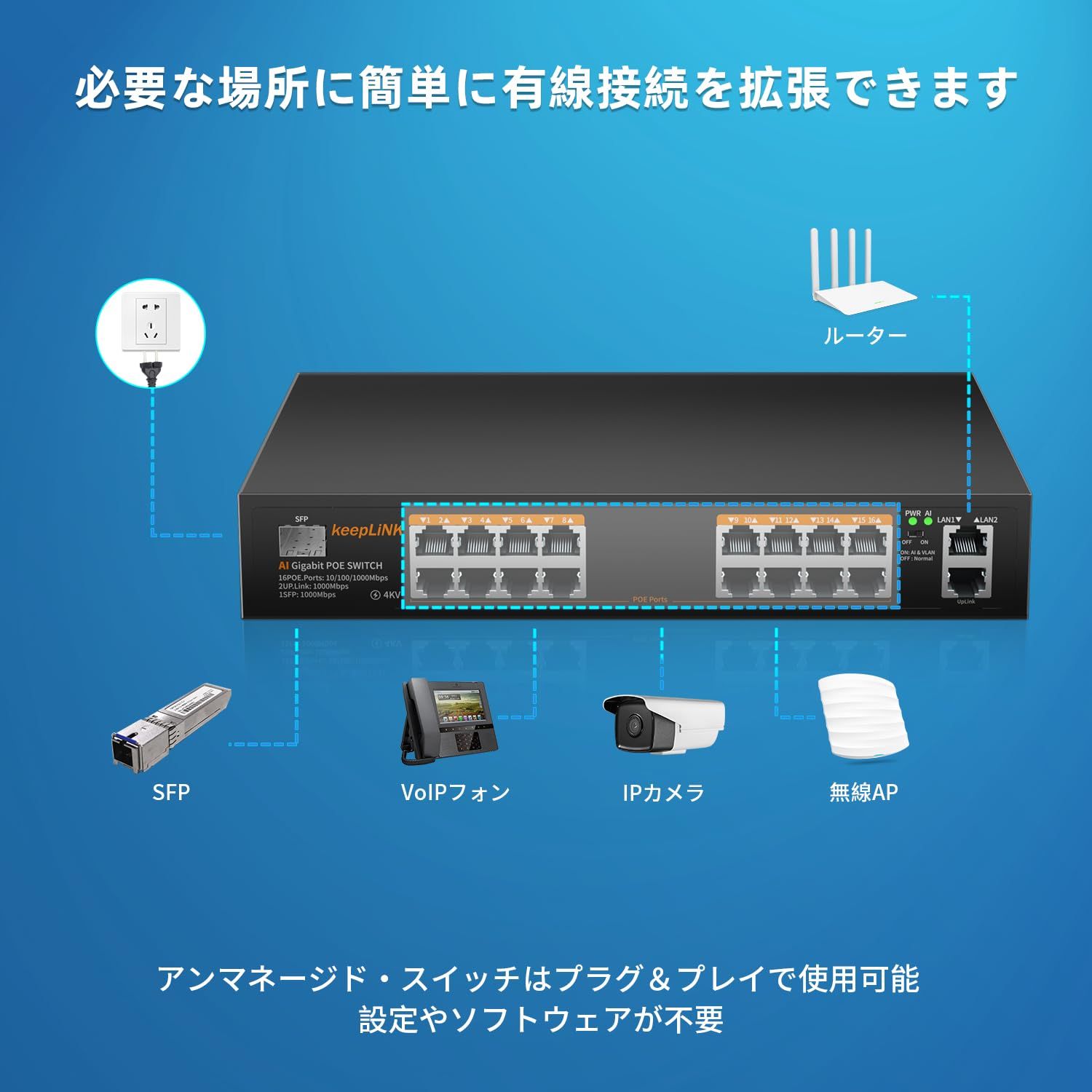 keepLiNK スイッチングハブ 16ポートGiga PoE (240W、 Giga PoE+ x16、Giga Uplink x2、1.25G SFP x1) 金属筺体 静音ファンレス 設定不要