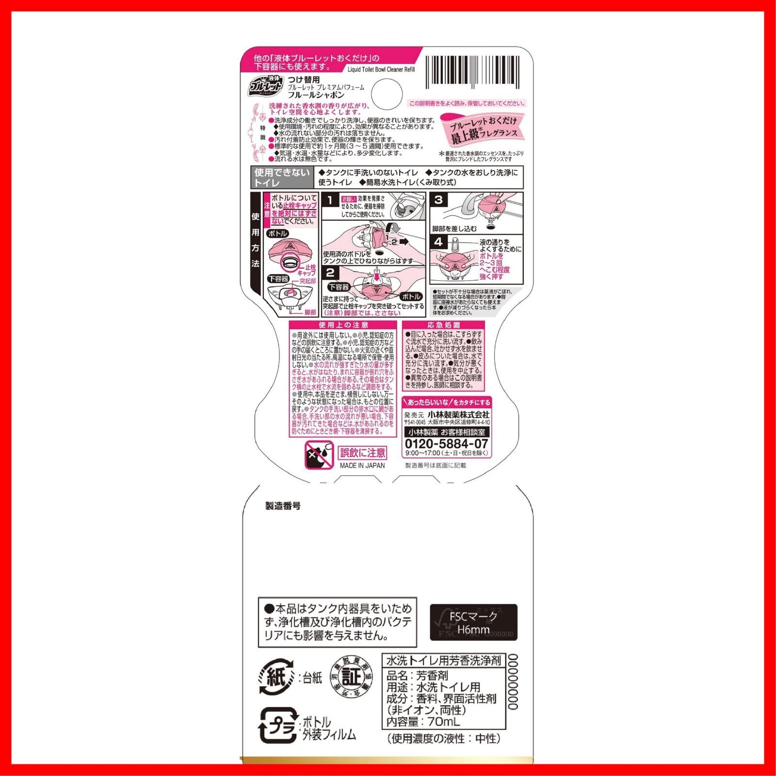 ●きらめくクリスタルボトルと、最上級の香水調フレグランスでトイレを華やかな空間にしてくれる、トイレ用洗浄防汚剤です●濃厚なエッセンシャルオイルで甘く華やかな空間をつくってくれる、ブルーレット史上最上級の香りです●最新のトイレにも違和感なくマッチする、透明感あるクリスタル調ボトルです●洗浄・防汚成分を配合。流すたびに便器表面をコートし、汚れの付着を抑えます●便器の輝きを保ちます●流れる水は無色です●標準的な使用で約1ヶ月間(3~5週間)使用できます
