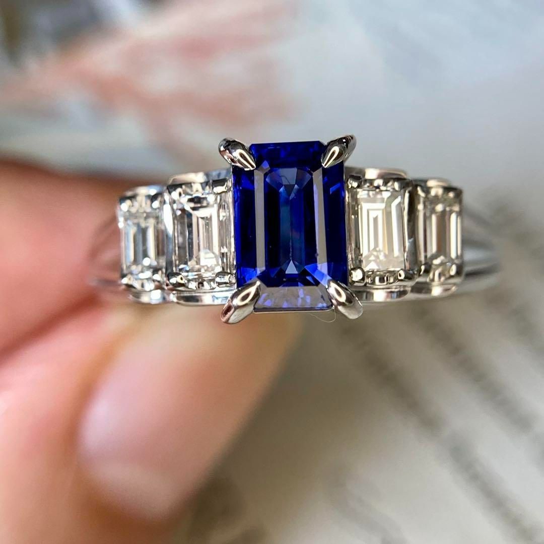 両脇には、輝きの際立つエメラルドカットのダイヤモンドを贅沢に配し、ロイヤルブルーの煌めきをより一層引き立てています。直線的なフォルムが、センターストーンの力強さと高貴な佇まいを際立たせ、全体に洗練された印象を与えます。