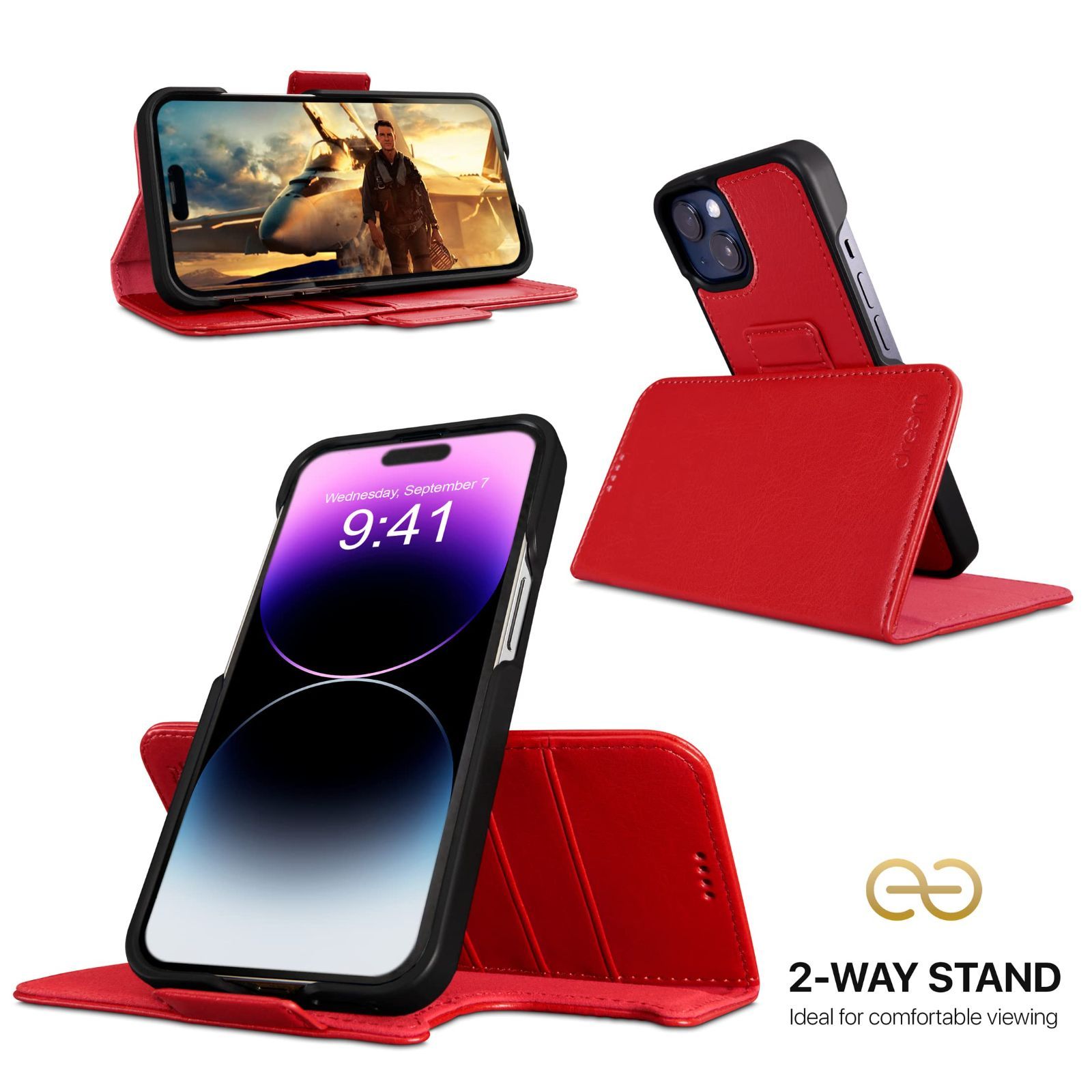 Dreem フィボナッチ(Fibonacci)2イン1 財布型ケース Apple iPhone 14 Plus用 - 高級ヴィーガンレザー製 マグネット着脱式 耐衝撃 携帯電話ケース RFIDカード保護機能 2通りに使えるフリップスタンド付き - レッド