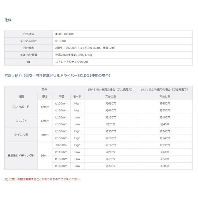 刃の寿命超硬刃:約200穴(コンパネΦ160mm、板厚12mm)