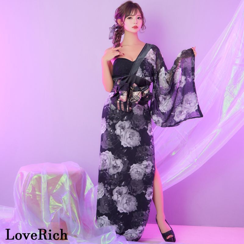 LoveRich ラブリッチ ライン 2点セット ワンショル アシンメトリー スリット 花柄 シフォン レース ロング 豪華 帯 花魁 着物 ドレス コスプレ キャバドレス 1295