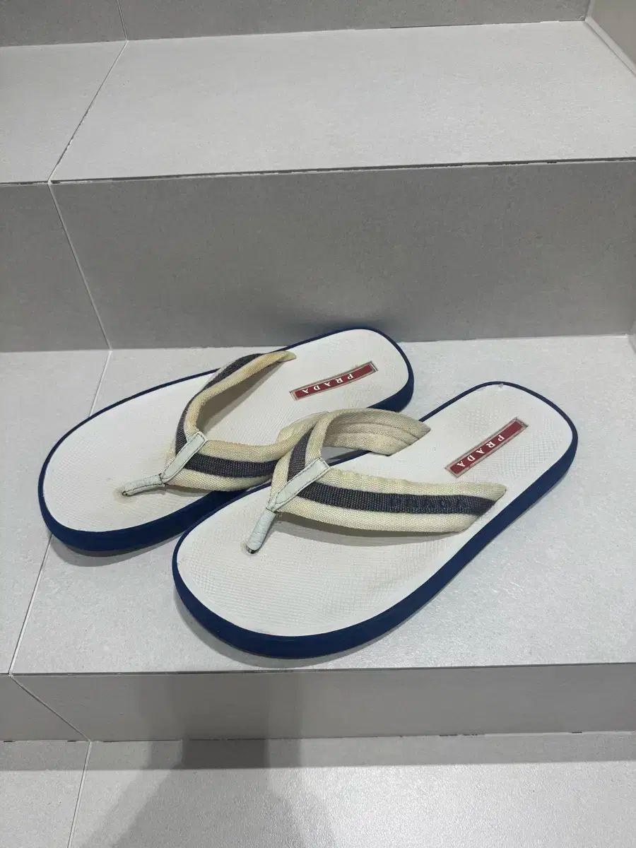 PRADA メンズ ビーチサンダル サンダル 出品。白 바탕にネイビー色 POINTが入ったスタイリッシュなデザインです。使用感は少しありますが、まとめ売りで傷なし良いです。別途コメントなければ馬狼 照英 安全決済 부탁드려요!