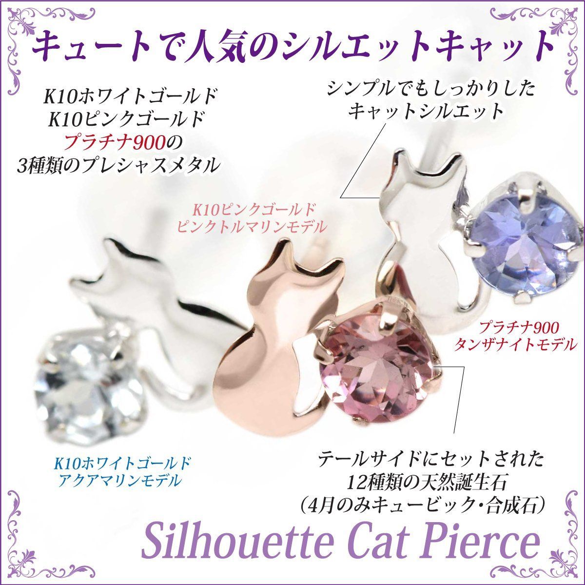 人気のキャットシルエットピアスです。石の位置も人気の高いテールサイド(尻尾の横)セッティング。