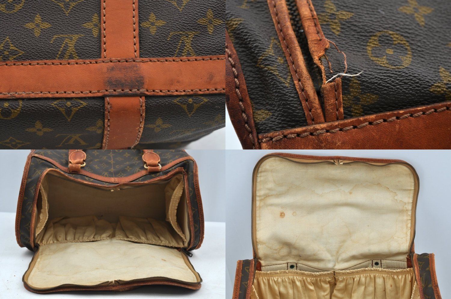 【その他状態】こちらの商品は旧モデルのため、ファスナーはECLAIR製です。旧モデルのためシリアルナンバーはございません。また、Made in(製造国)の記載もございません。外側の革が一部破れ、剥がれております。ファスナー生地が一部ほつれております。持ち手と持ち手付け根の革が若干破れております。