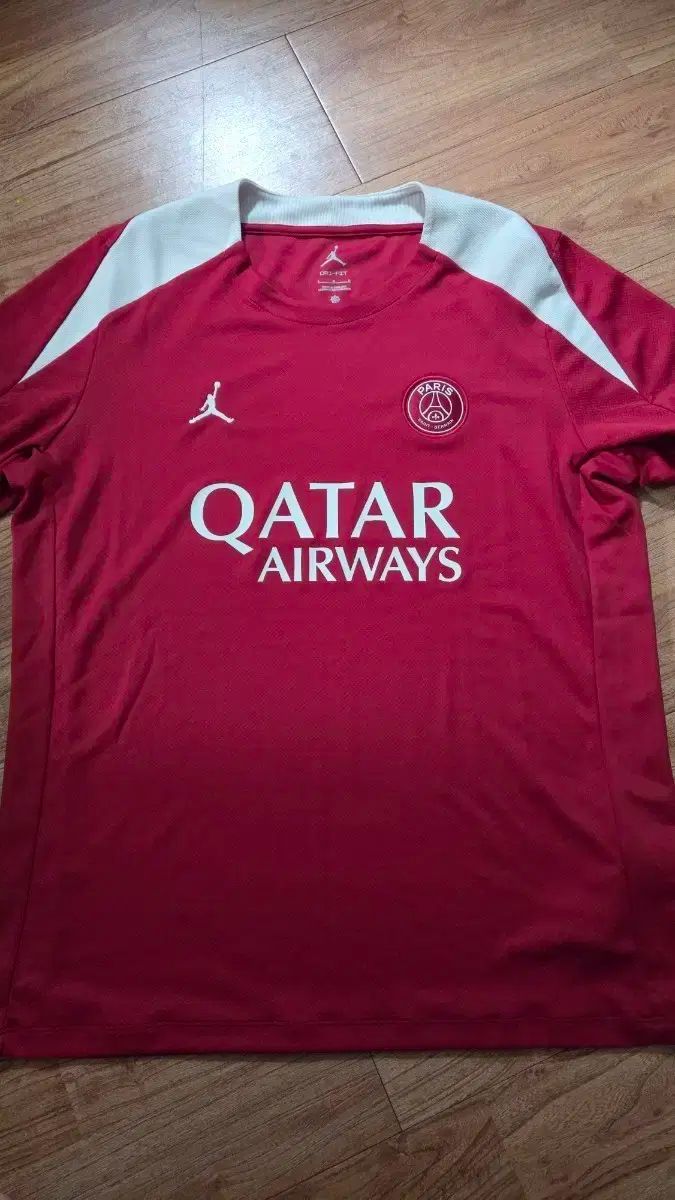 これは赤い色のヨルダンパリサンジェルマンカタールジャージです。胸にカタール航空のスポンサーマークが見えます。フランスで買いました