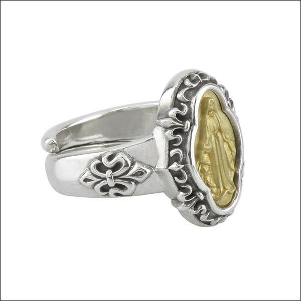 A ring that fuses solemn grace with modern edge. At its center, a brass Madonna radiates an antique aura, framed by a gothic arabesque design that brings an air of timeless storytelling to the hand. Delicate fleur-de-lis motifs on each side symbolize elegance and devotion, while the deep brilliance of sterling silver contrasts beautifully with the warm, subdued gold tone of brass—an interplay of light and shadow that commands quiet yet undeniable presence.