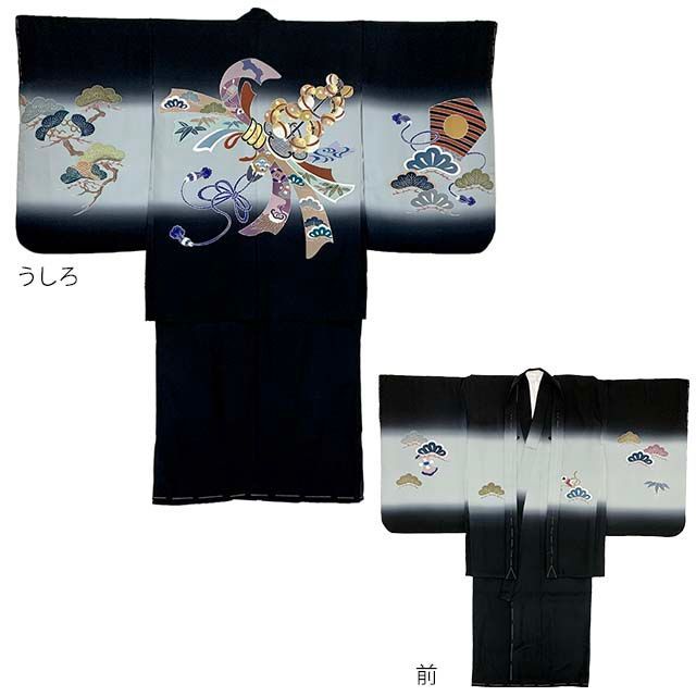 七五三 5歳男の子 正絹着物アンサンブル 手描き友禅 黒 束ね熨斗柄と神楽鈴