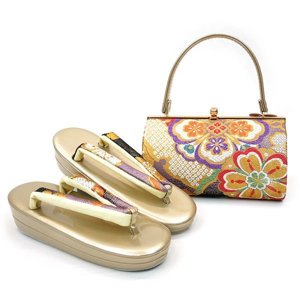 Lサイズ 振袖用 草履バッグセット zb-033 帯地 成人式 振袖 華文 雪輪 ゴールド 金 県 は 京都うさぎ堂