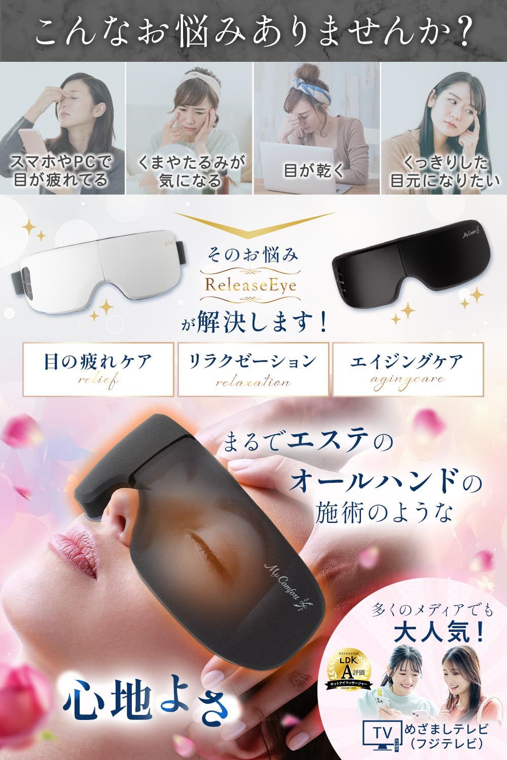目の美容院監修 MyComfort アイウォーマー アイケア 目元から温める ワイドヒーター設計の温め機能搭載 Type-C充電 Bluetooth音楽再生機能 リリースアイ プレゼント 敬老の日 ギフト に ホワイト