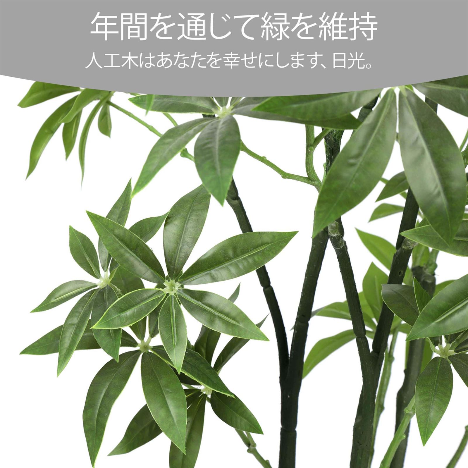 【自然なデザイン人工観葉植物】本物の生育特性をシミュレートし、実際の植物の生き生きする姿を再現しています。人工観葉植物の古い葉から新しい葉へと緑の濃さ・葉の大きさを変えることで、よりリアルな印象になっています。幹はねじりタイプのフェイクグリーン パキラ。茎はワイヤー入りなので、お好きな形に動かすことでより自然な仕上がりになります。