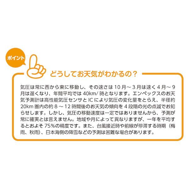 ●気圧センサを内蔵し気圧の変化から約半日後のお天気傾向を「晴」「快方に向かう」「下り坂」「雨」の4つのシグナルでお知らせ。