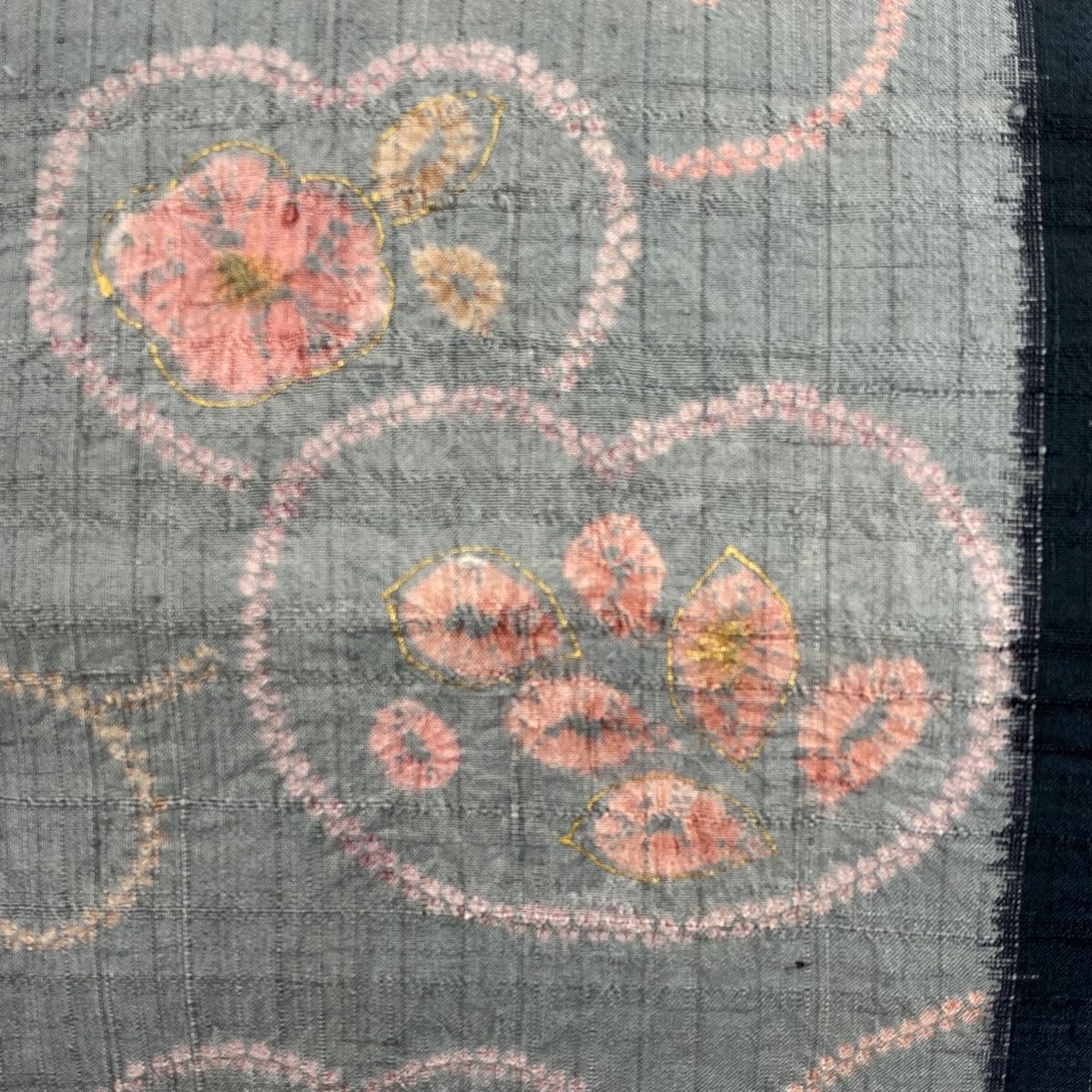 開き名古屋帯 秀品 紬地 草花 唐草 絞り 金彩 灰緑 正絹