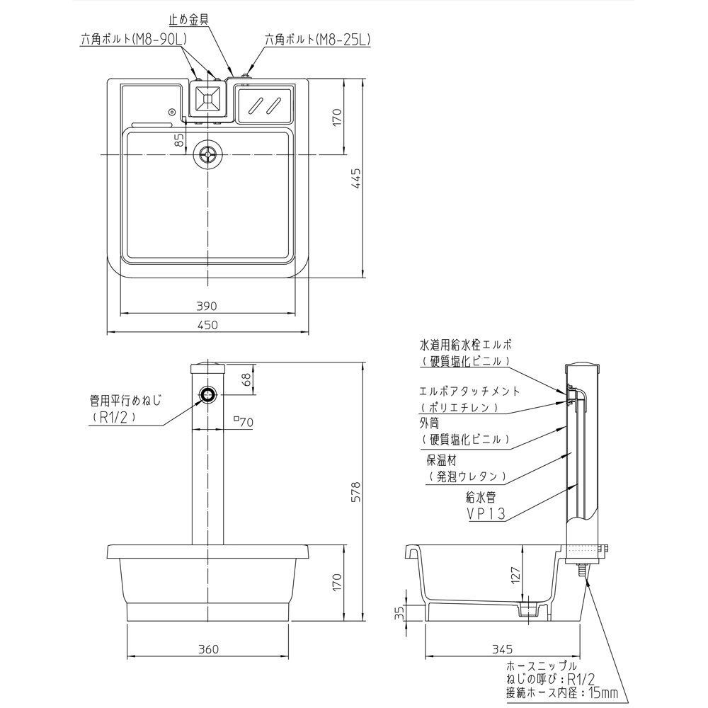 ※組立式です。組立てには、市販の水栓、耐圧ホース及びホースバンドが必要となります。 固定の排水管に接続する場合は、排水管はVU42を推奨します。
