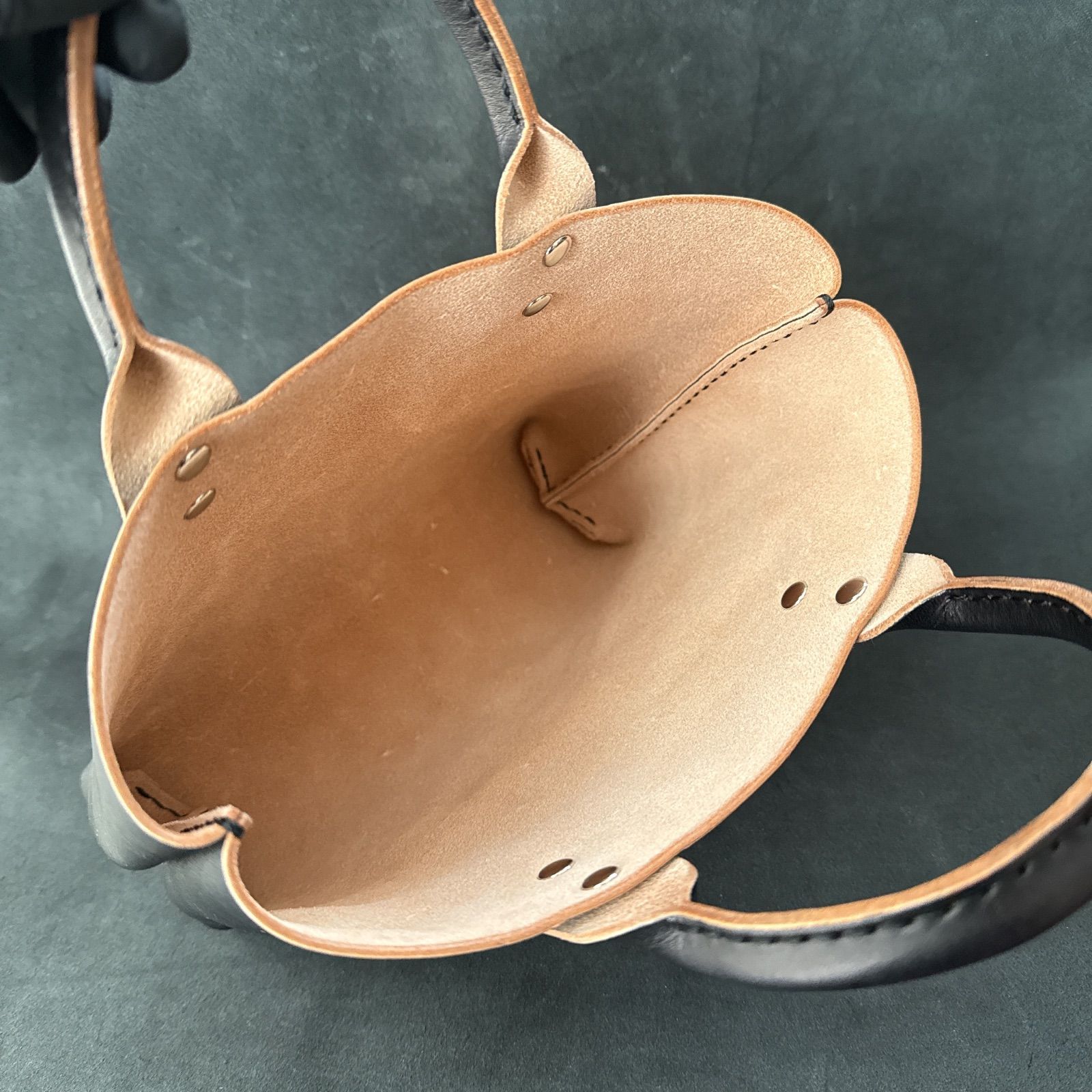 国産レザーを使用し、表面だけをブラックに手染めした丘染(おかぞめ)仕上げのミニトートバッグ。