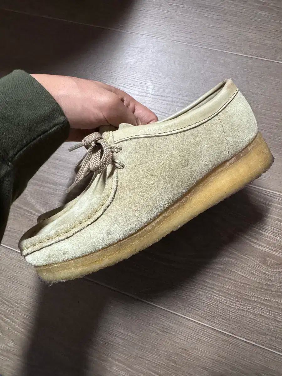 クラークスのワラビーシューズはベージュです。クレープソールなので、ふんわりしていて履き心地もいいです。ストラップも同じベージュ色で統一されているので、よりかわいらしいです。ご不明な点がなければ、すぐに安心してお支払いいただけます!