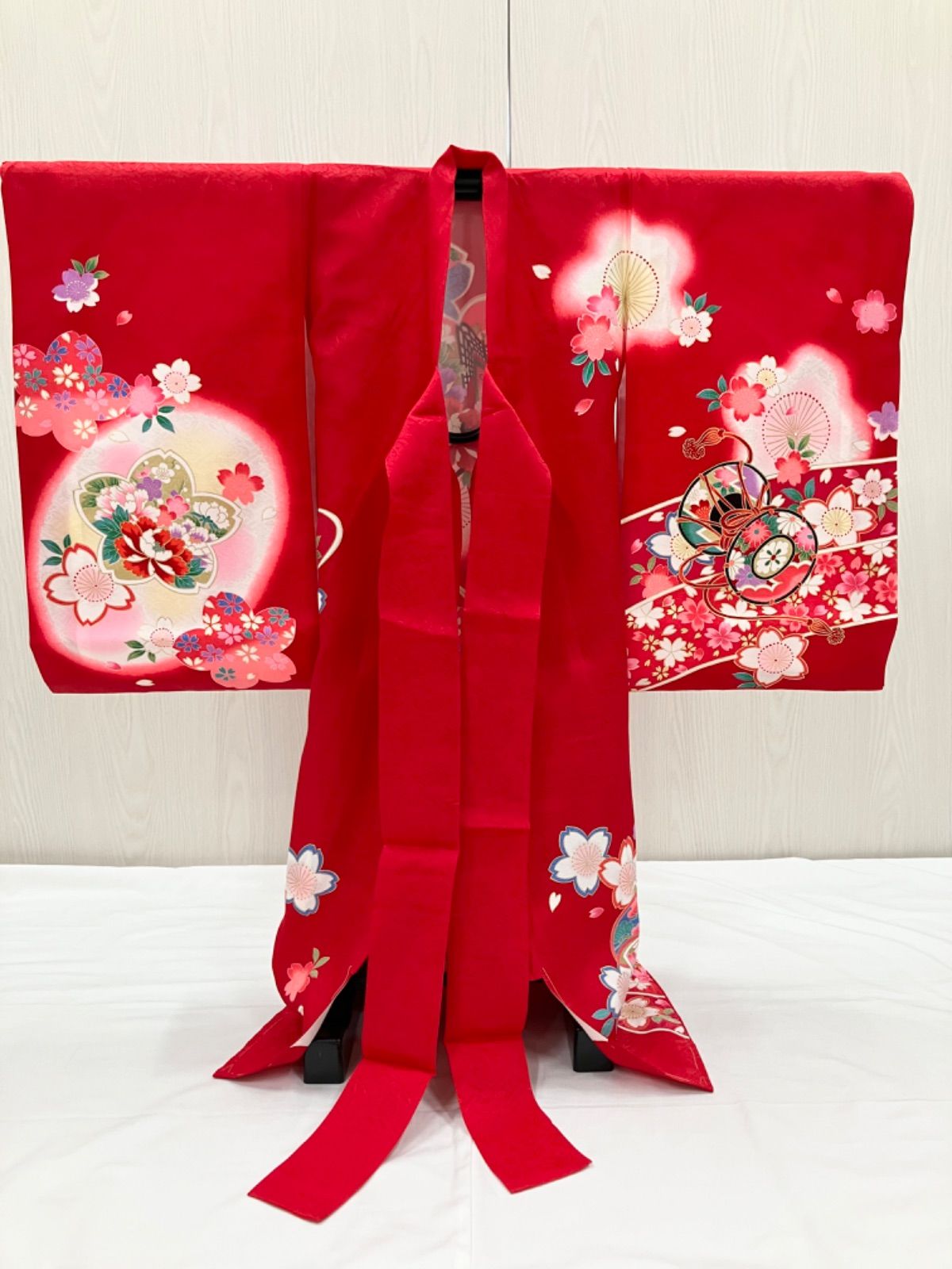 鮮やかな赤に御所車や鼓などが描かれた桜のモチーフが素敵です