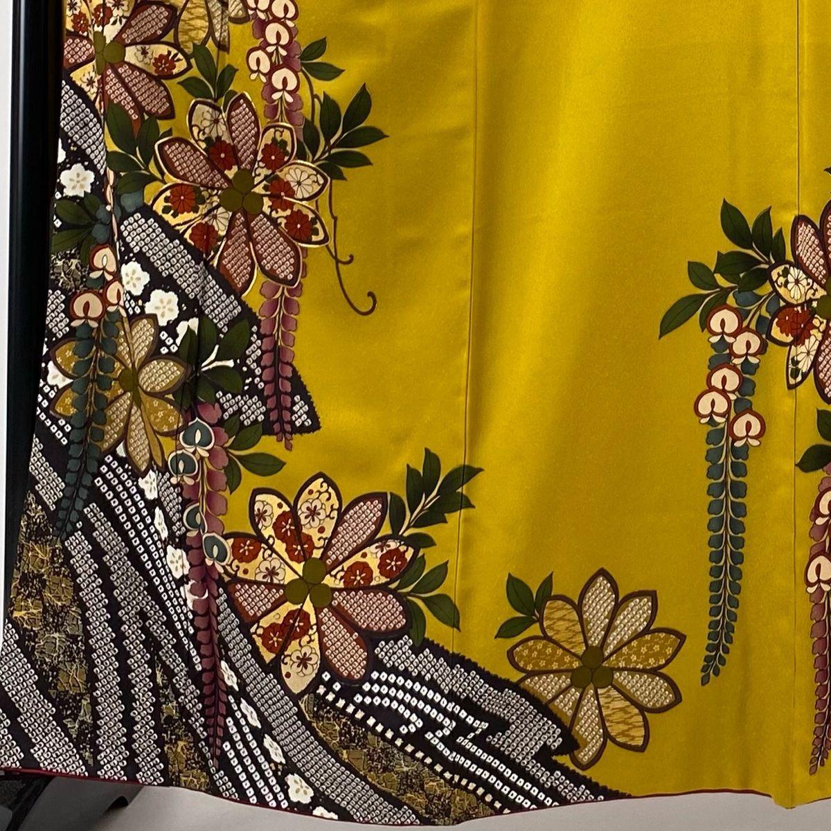 振袖 身丈162 cm 裄丈70 L 袷 藤 花柄 金糸 金彩 山吹色 正絹