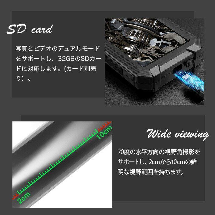 内視鏡は5.0インチIPSディスプレイを備えています。 最大1920×1080Pの解像度をサポートし、70度の水平方向の視野角撮影をサポートし、2cmから10cmの鮮明な視野範囲を持ちます。写真とビデオのデュアルモードをサポートし、32GBのSDカードに対応します。(カード別売り)