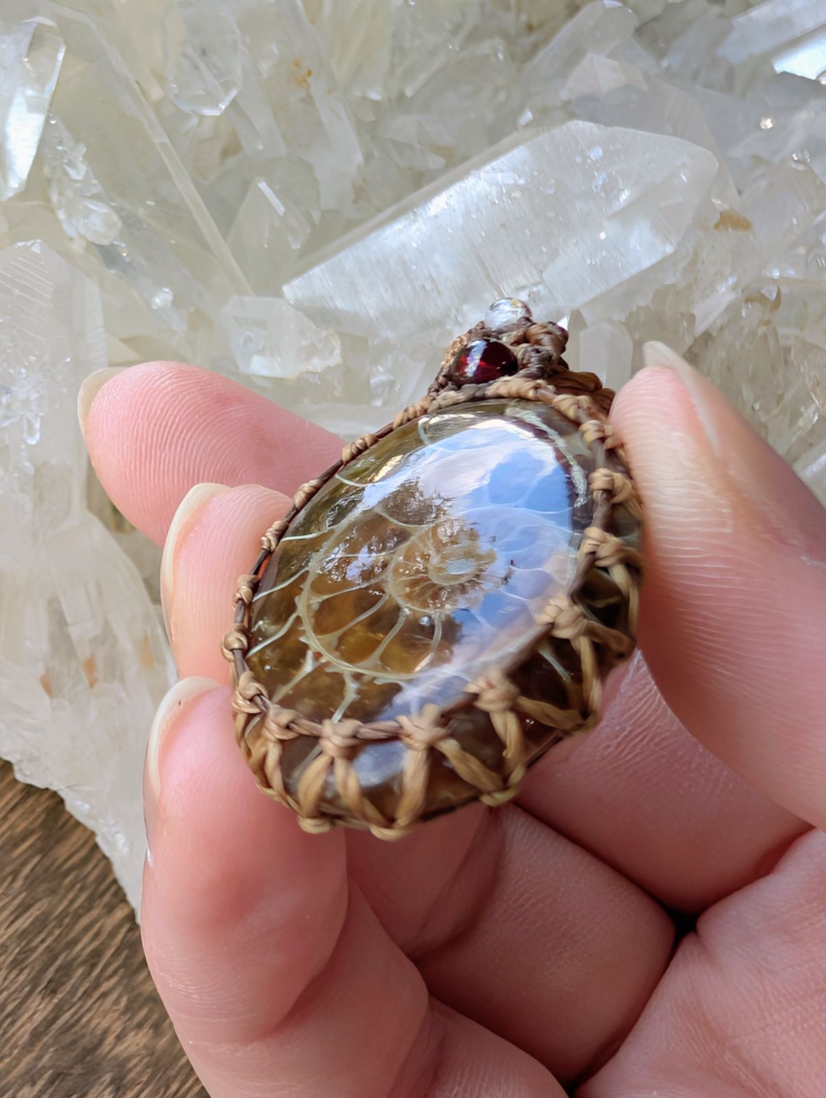 古代のアンモナイトに、サポートストーンにガーネット&水晶を合わせ、古代のアンモナイトに少し明るさを取り入れたネックレスに仕上げました✨