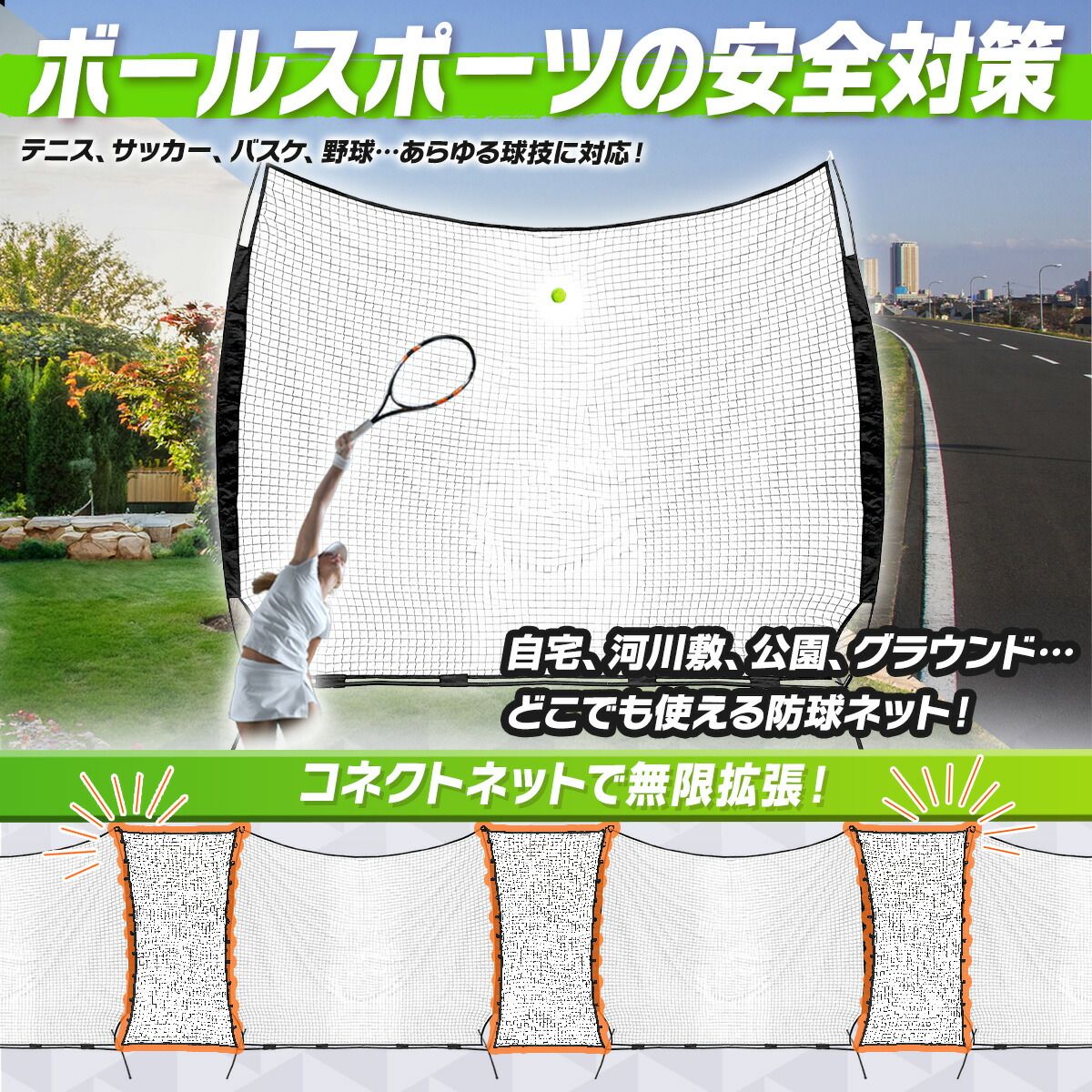 【様々なボールスポーツに】ネットの下からもボールが抜けない安心設計。専用のコネクトネット(別売)を使うことで、無限に連結可能となり、角度をつけて設置することも可能となっております。自宅や河川敷、公園、グランド、どこでも使えます。