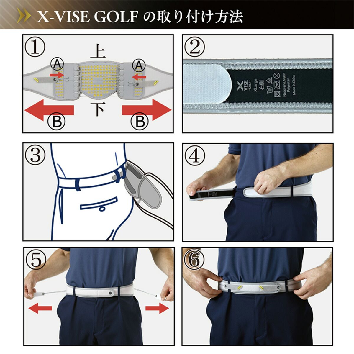 X-VISEベルトとは? 誰でも簡単に表着可能な、腰部をサポートする特許構造の“滑車式骨盤ベルトです。 装着することで骨盤を理想の状態に導き、豚や姿勢のお悩み、運動能力向上に役立ちます。 締め付け力は上下で調整できオーダー品の様にフィットします。 X-VISE GOLF 商品詳細 内容:ベルト本体/ランバーパット/携帯用専用袋 カラー:グレー、ブラック サイズ: Sサイズ(63-83cm)Mサイズ(83-93cm)Lサイズ(93-104cm)XLサイズ(104-116cm) 身体測定方法(パンツベルト位置の全周長) ※サイズ選びに迷われた場合は、大きいサイズをお選びください。