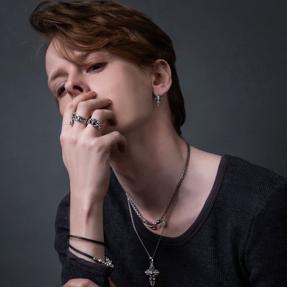 幾重にも重なる唐草と十字架で、クロスを象ったアートなピアス。細かく繊細に彫り込んだデザインで、丁寧に造られた精巧な作り。程よいサイズで着け心地も良好。裏にはブランドと925の品質刻印。センターの石はCZクリアー。※1個単位(片耳分)での販売となります。