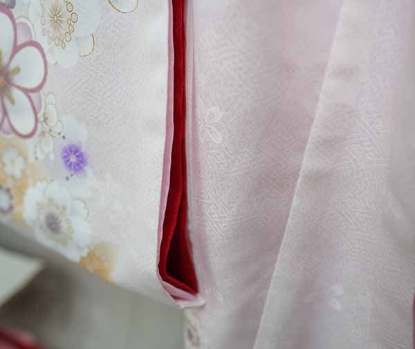 綺麗な地模様が施された美しい生地に金駒縫や鮮やかな染色を施した華やかな祝着です。