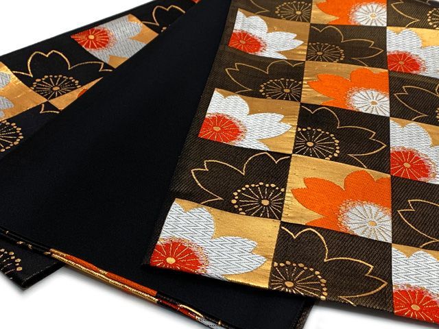 七五三 袋帯 正絹 桐生織 こども ジュニア用 全通の女の子用祝帯 仕立て済み 黒系 市松 JFS 569
