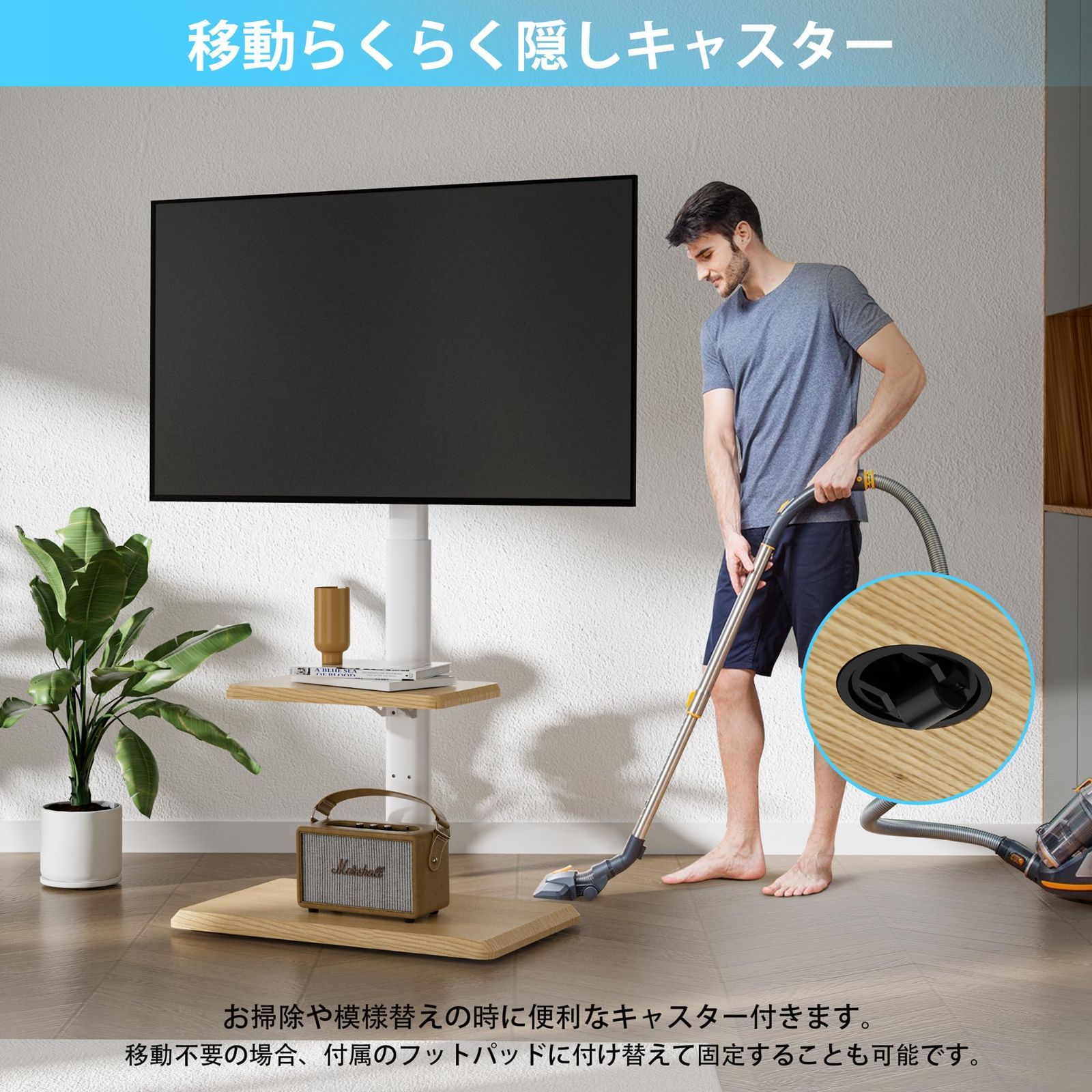 【高さ調節可能】取り付け部中心から床まで、高さがそれぞれ104cm、109cm、114cm、119cm、124cm、129cmに調整できます。異なる身長のユーザーがテレビの高さに対する要求を完璧的に満たし、便利で快適な視覚的な楽しみを実現します。