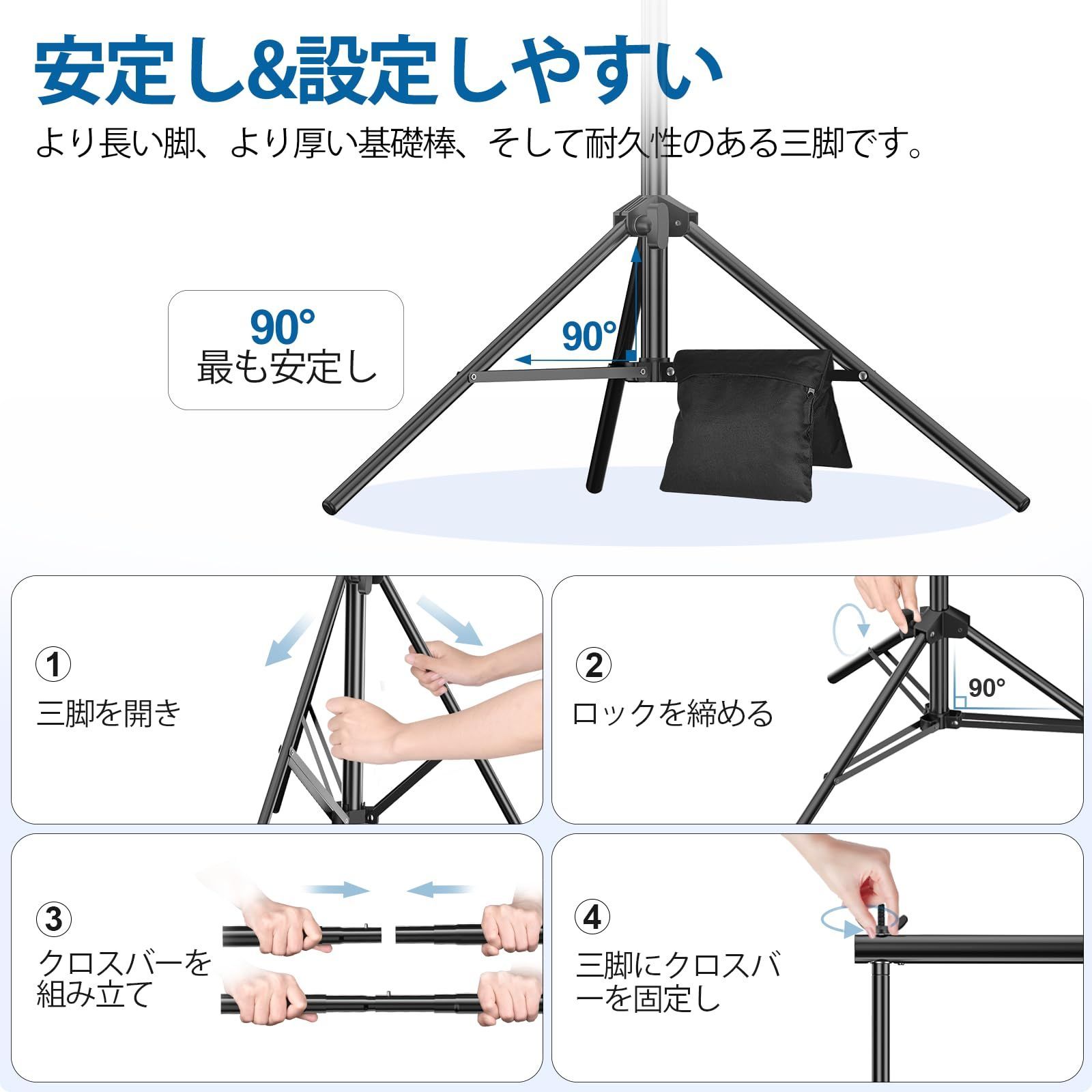 【豊かなアクセサリ】強力クリップが背景布、背景紙、暗幕やクロマキースクリーンなどしっかりと背景布スタンドに固定され、脱落することが絶対に起こらりません。高い場合や吊り下げられた物体が重い場合にも不安定になる可能性があります。ナイロン製のサンドバックは底部の重量が増加し、背景スタンドの安定性が向上します。キャリーバッグはプレミアム品質のナイロン素材で、持ち運びやコンパクト収納に便利なバッグです。