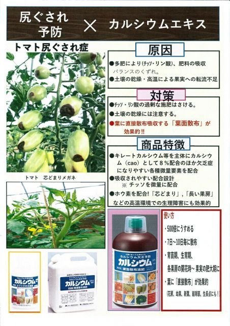 本品は、即効性の葉面散布のカルシウム液肥なので、速やかに作物にカルシウムの補給ができます。