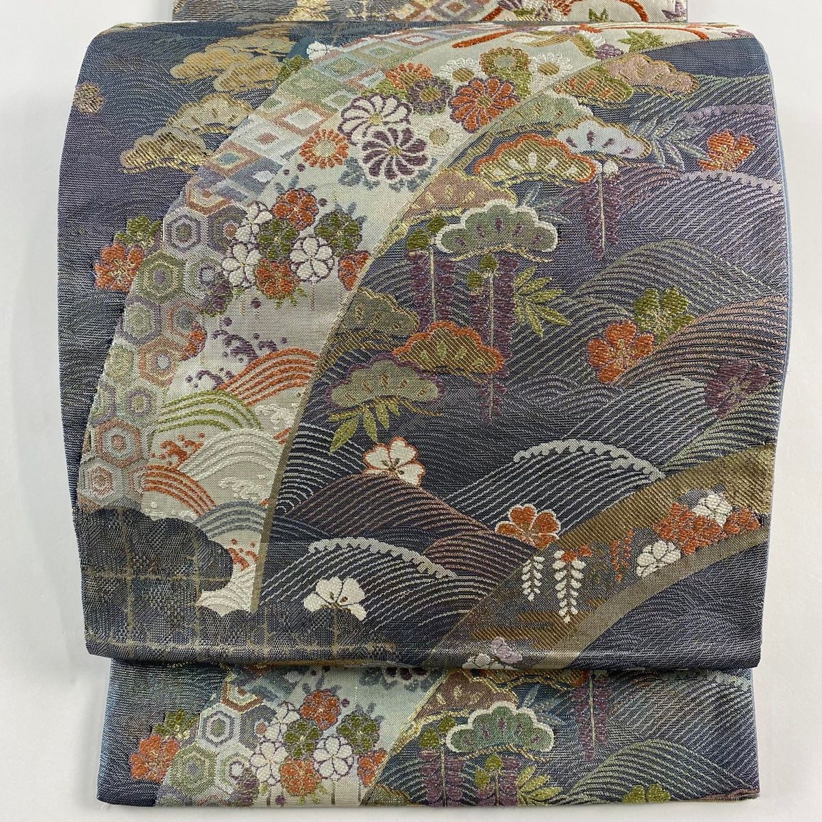 袋帯 秀品 証紙 花鳥 笠松 金糸 箔 灰色 六通 正絹