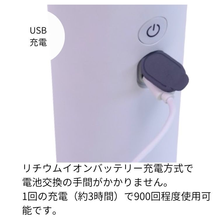 リチウムイオンバッテリー充電方式で電池交換の手間がかかりません。USBポートから充電でき、1回の充電(約3時間)で900回程度使用可能です。