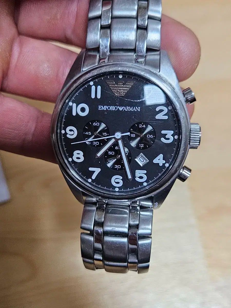 エンポリオアルマーニ メタル時計です。銀色メタル時計に黒ダイアルがよく合います。使用感はありますが、依然として素敵に着用できます。別途コメントなければすぐ安全決済をお願いします!
