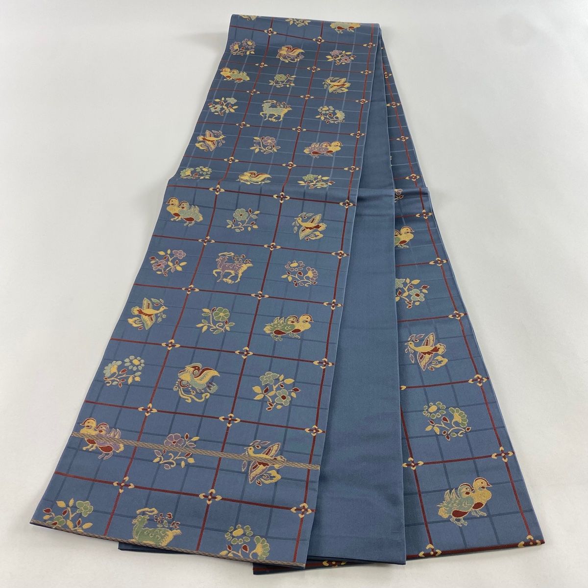 袋帯 秀品 落款 あらいそ 関西仕立て 格子鳥獣紋 草花 箔 紺色 全通 正絹