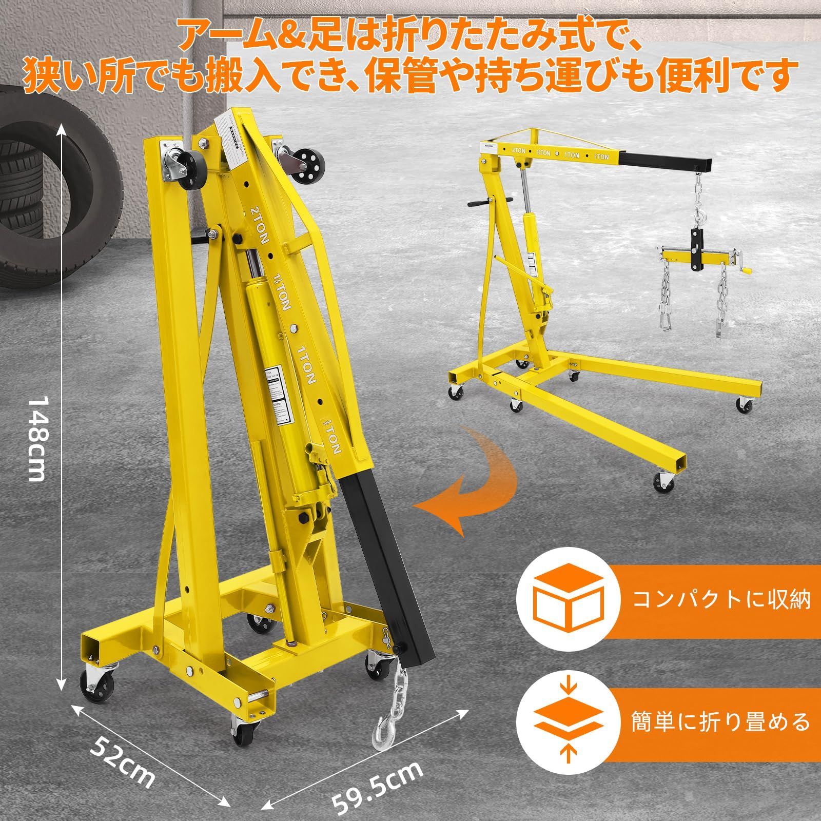 ガービー Garvee エンジンクレーン 2 t 4段階調節 油圧式 折りたたみ キャスター付き エンジンハンガー付き 2000 kg 作業工具 コンパク収納 吊り上げ 吊り下げ 家庭用 黄色