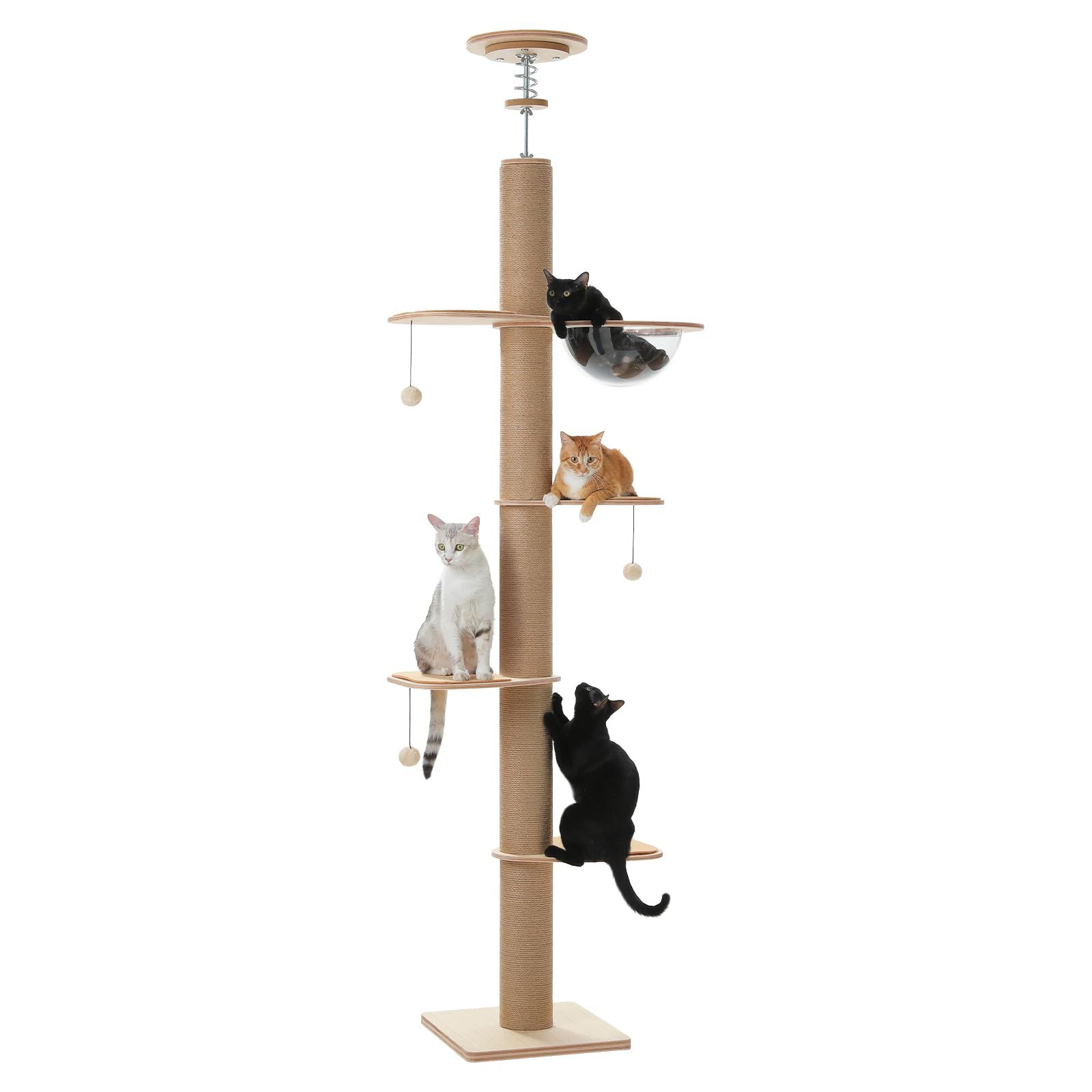 PETEPELA(ぺテぺラ) キャットタワー 突っ張り 木製 全面麻紐 爪研ぎ 直径10.5cm 極太 スリム 大型猫用 猫タワー 木目調 夏 木登りタワー おしゃれ 多頭飼い クリアボウル 宇宙船付き 滑り止めマット おもちゃ 登りやすい インテリア 安定 運動不足解消 - ベージュ 高さ調整幅200.5-261.5cm