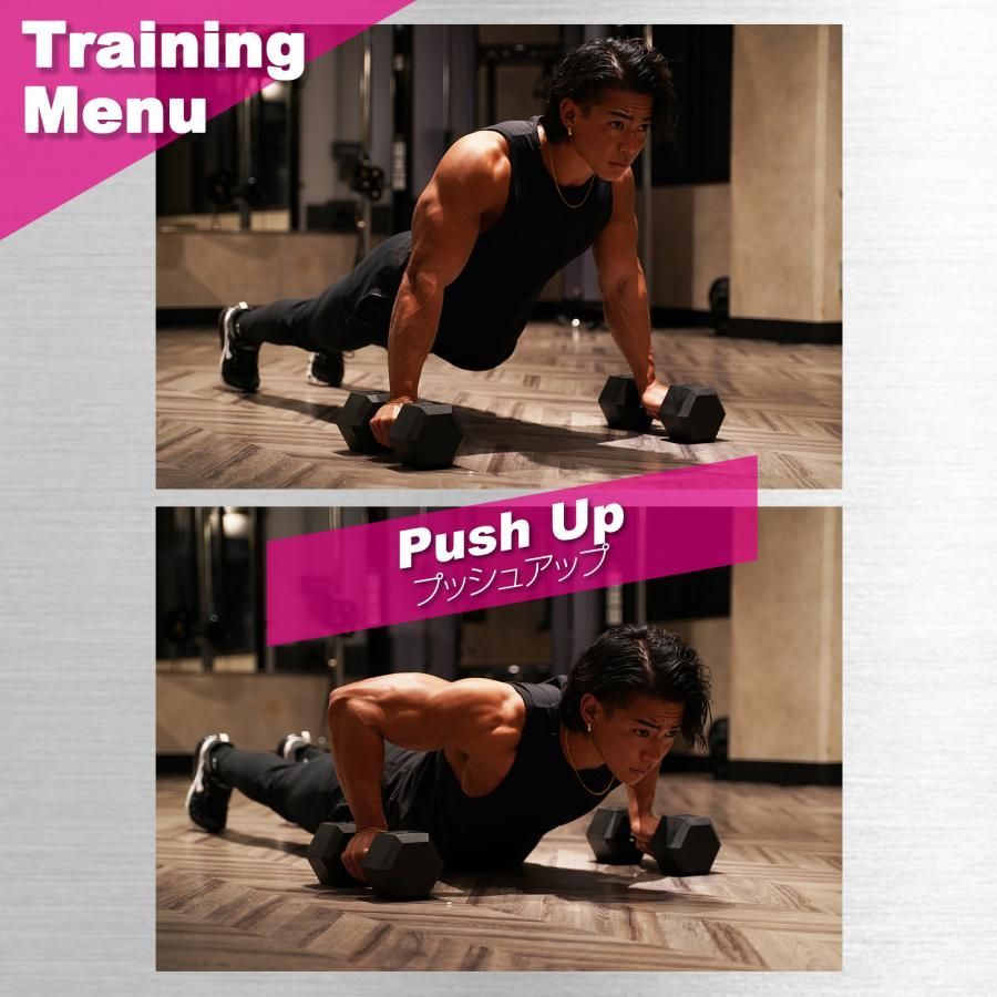 「ダンベルプッシュアップ」や「ダンベルプッシュアップローイング」など、