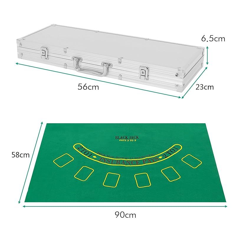 *セット内容:チップx500枚;ケース/シルバーx1個;サイコロx5個;トランプx2組;マットx1枚;ディーラーボタンx3個;鍵x2本