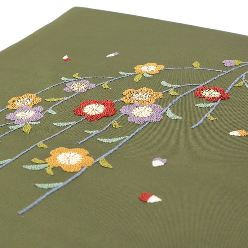 落ち着いた深緑の地に、紅・紫・金糸の桜が可憐に咲きこぼれる枝垂桜文。