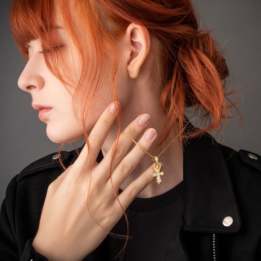 1繊細な光を集めるミニマルなクロスペンダント。SV925に10金イエローゴールドを纏わせた上質なメッキが、肌に柔らかな艶を落とします。片面は微細なパヴェが星屑のように瞬き、もう片面はレイヤードクロスが立体的な陰影を描くリバーシブル設計。小ぶりながら大人の存在感を放ち、Tシャツからジャケットまで装いをエレガントに格上げします。ブランドの美学を、提携アトリエの手しごとで丁寧に仕立てた作品です。片面にブランドロゴと“925”の品質刻印。10金YGメッキを施したSV925チェーン付き、全長50cm(45–50cmに調整可)。ユニセックスで、ギフトやペアにも最適。長く愛せるモダンなアイコンです。