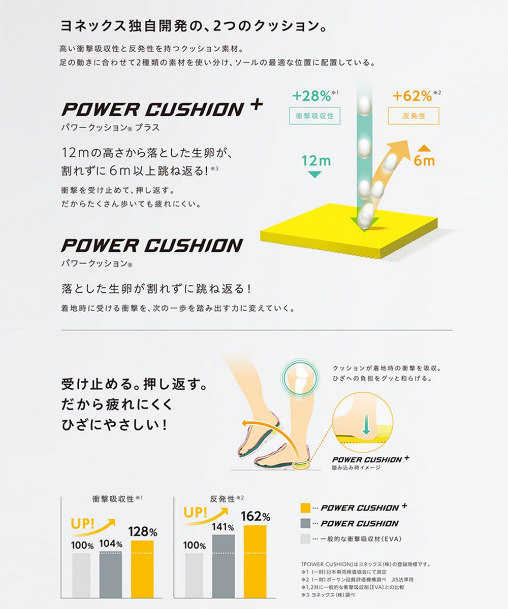 弊社独自の衝撃吸収性と反発性を併せ持つ衝撃吸収素材パワークッション。パワークッションに反発性の高い特殊樹脂を添加し、格子状に+型の溝を最適な間隔と深さで配置した新構造を採用した「パワークッションプラス」は、従来の軽量性を保ちつつ、衝撃吸収性を28%※1、反発性を62%※2向上させ(一般的な衝撃吸収材[EVA]との比較)、12mの高さから落とした生卵が、割れずに6m以上跳ね返る※3新衝撃吸収反発素材です。 ※1 (一財)日本車両検査協会にて測定 ※2 (一財)ボーケン品質評価機構調べ JIS法準用 ※3 ヨネックス(株)調べ