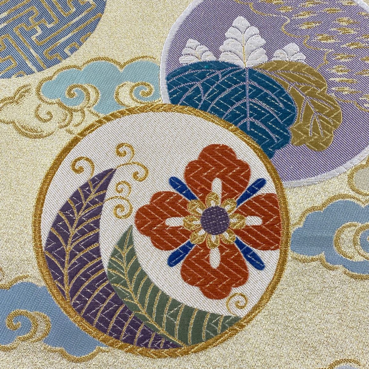 袋帯 秀品 丸文 花菱 金糸 箔 金色 六通 正絹