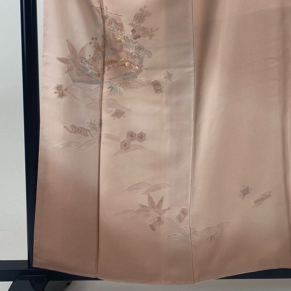 付下げ 身丈159.5 cm 裄丈65 M 袷 宝舟 波 蘇州刺繍 ぼかし ピンク 正絹 秀品 一つ紋