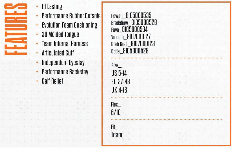 最も需要の高いTEAMライナー搭載の「LASHED」。THIRTYTWOの代名詞EVOLUTION OUTSOLEで超軽量なアウトソールにPERFORMANCE RUBBERを配置し、グリップ力とレスポンスをUP。程よい締め上げを可能にするTEAM INTERNAL LACING SYSTEM。ミディアムなフレックスに程よいホールドで誰もが扱いやすい人気NO.1モデル。